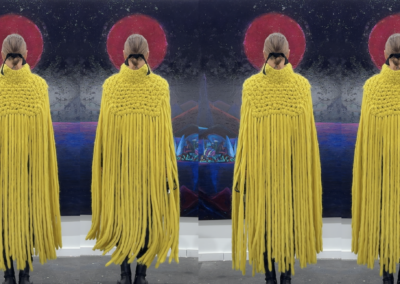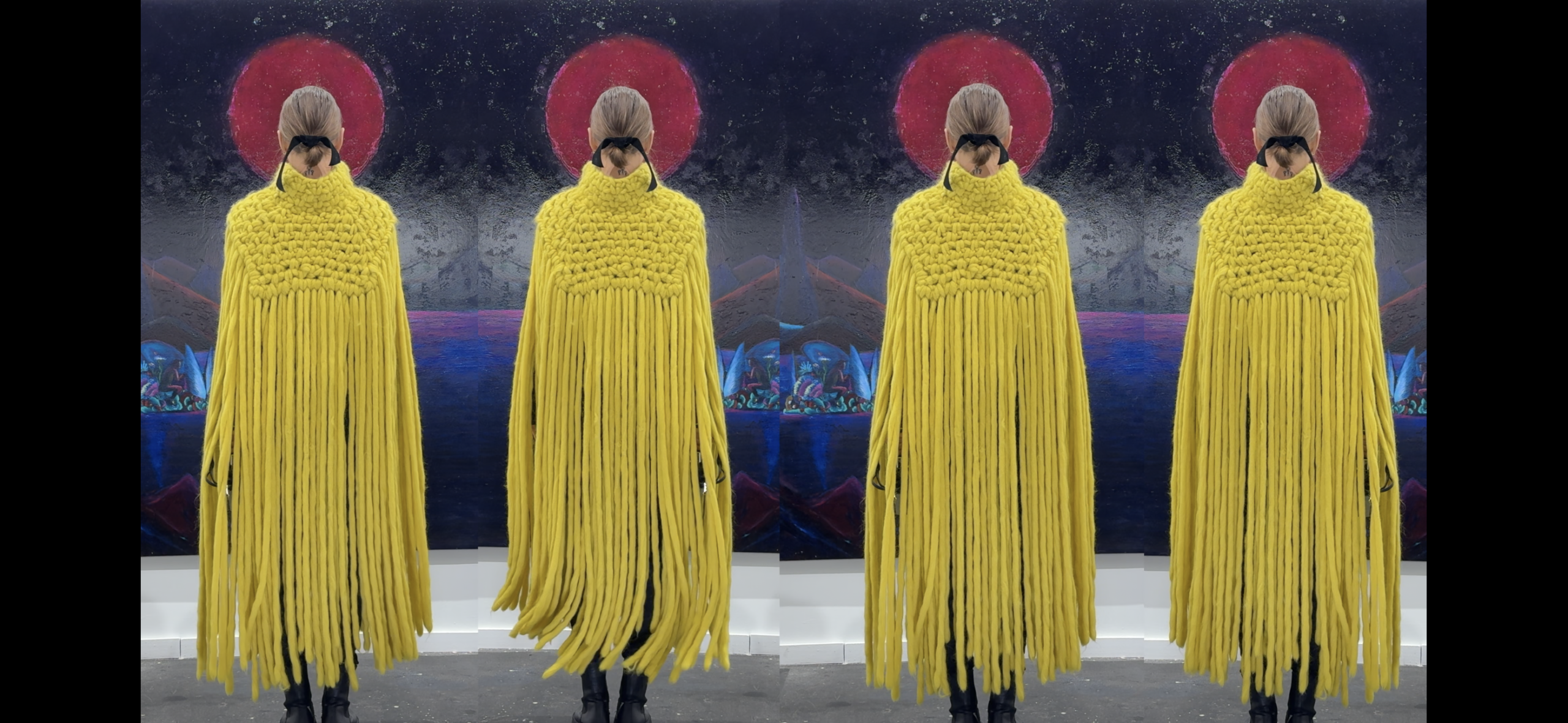 Nastya Almina se viste —o más bien, se prende— con las manos de Hilando el Tiempo, en una capa merina radiante que parece hilar presente, pasado y futuro. Una prenda que da poderes mágicos para desenvolverse en la feria en disfrute total, con curiosidad y coraje creativo.